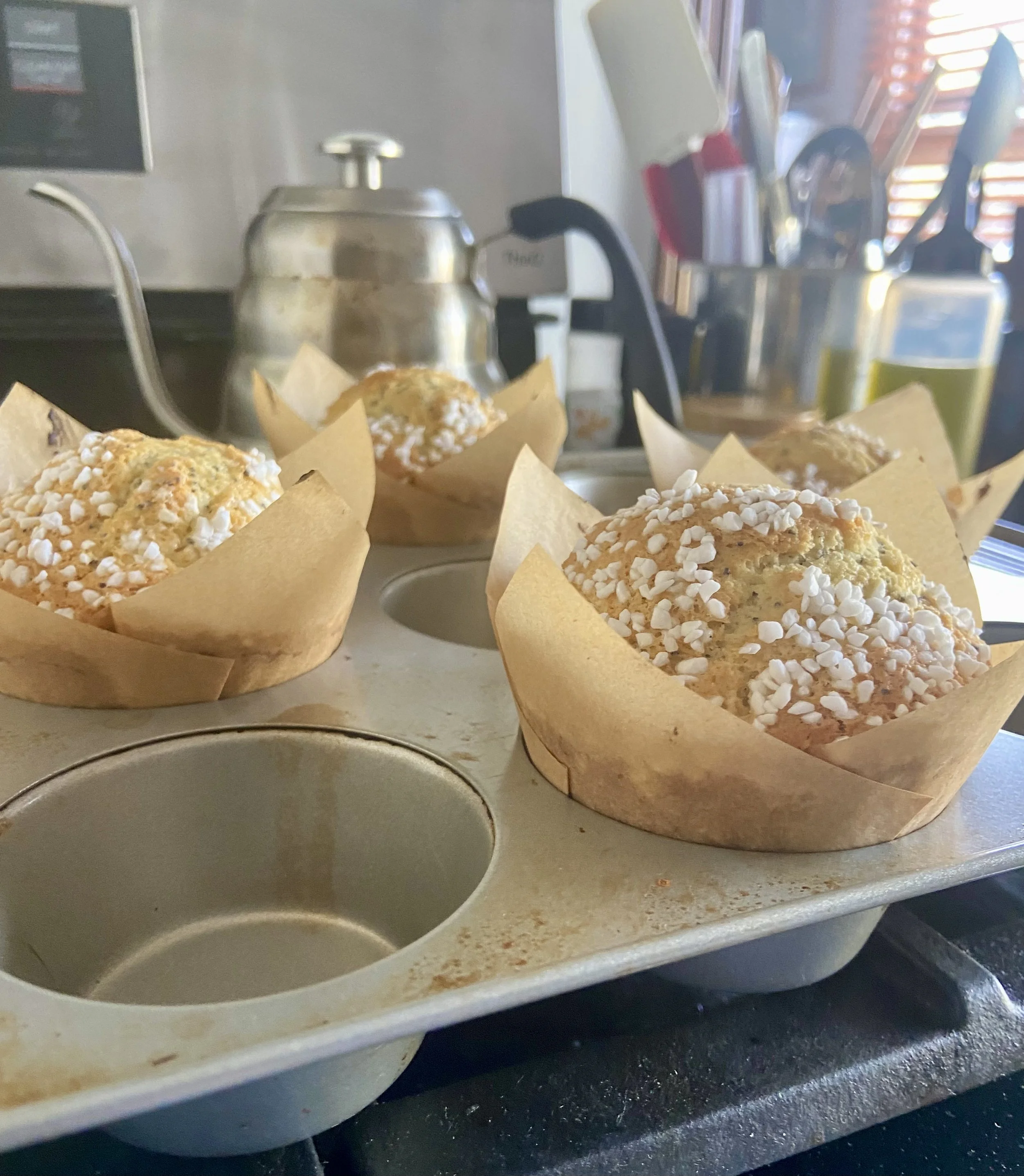 Once the batter has rested, without stirring, use a 3 tablespoon cookie scoop, place 2 scoops into each muffin tin. Each space will be filled just about to the top, but not to worry, they won’t overflow while baking. Sprinkle each top with a little Swedish pearl sugar.