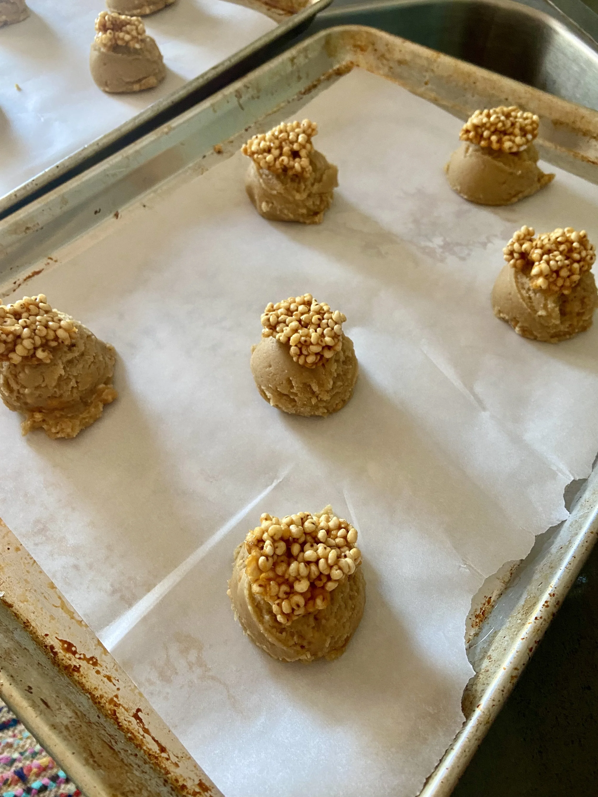 Arrange the scooped dough on the sheet trays, about 2” apart. Place a chunk of caramel crunch on the top of each cookie scoop and bake for 13-15 minutes, just until the edges are lightly golden and the center is just set.